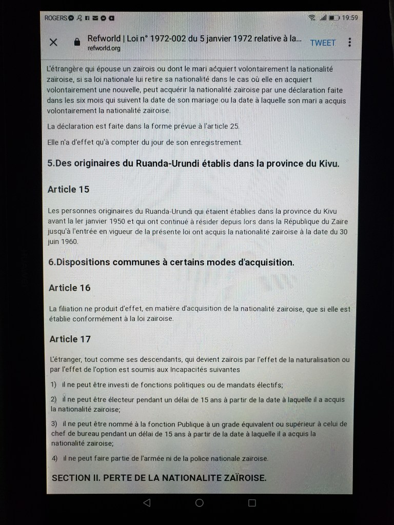 [v] Selon la règle de l’équité et le principe de justice, la loi N0 1981 – 002 du 29 juin 1981, pour manifester sa pleine et entière volonté de déposséder de la nationalité zaïroise les personnes des communautés tutsies, se devait de citer nommément ces originaires du Ruanda-Urundi comme l’ont manifestement accompli le décret-loi N0 1971 – 020 du 26 mars 1971 et la loi N0 1972 – 002 du 5 janvier 1972. Ces deux textes de loi n’ont pas été littéralement ambigus ou flous dans leur énoncé ou l’affirmation de leur volonté de reconnaître la nationalité congolaise aux individus précités. Donc, en demeurant évidemment silencieux et visiblement flou, pratiquement ambigu, cela signifie clairement et nettement que le législateur zaïrois n’avait pas du tout la volonté d’ôter cette nationalité aux Tutsis. Cela veut dire tout simplement qu’il n’avait pas surtout et à ce point précis la volonté manifeste de s’engager ouvertement sur cette question brûlante ou de répondre aux desiderata des populations autochtones. En refusant de s’engager clairement, ouvertement, ou en laissant à l’opinion publique interne mal outillée en droit le soin d’interpréter cette disposition législative, craignait-il déjà le spectre d’une guerre civile atroce dans cette région de l’Est ?