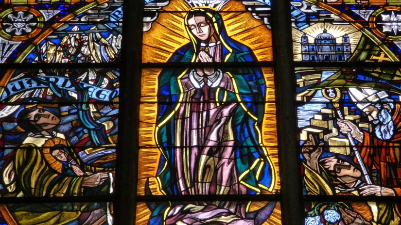 Face au chaos qui le guette et participe à sa destruction sur tous les plans, l’humanité assiste au retour du religieux. Vitraux de l’Eglise représentant le culte marial.